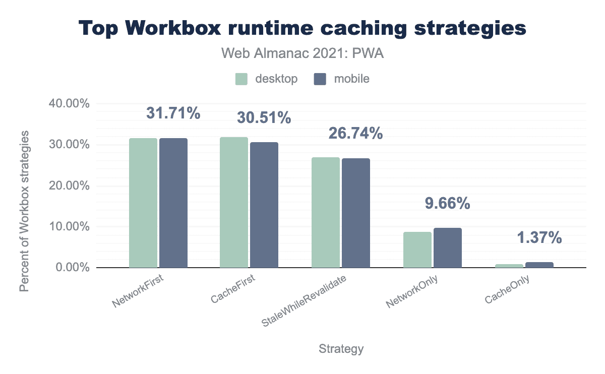 NetworkFirst がデスクトップで31.52%、モバイルでは31.71%、CacheFirstが31.72%と30.51% 、StaleWhileRevalidateが27.03%と26.74% 、NetworkOnlyが8.81%と9.66% 、そして最後に CacheOnly が0.92%と1.37%でキャッシュストラテジーに選ばれました。