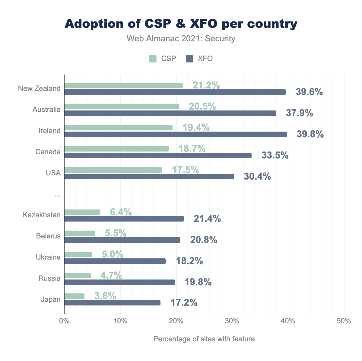 CSPや X-Frame-Options などの特定のセキュリティ機能の採用状況を見ると、国によってさらに顕著な違いがあり、成績上位の国のサイトは成績下位の国に比べて、これらのセキュリティ機能を採用する傾向が2~4倍も高いことが分かっています。また、HTTPSの採用率が高い国は、他のセキュリティメカニズムの採用率も高い傾向にあることがわかります。これは、セキュリティはしばしば全体的に考えられ、さまざまな角度からカバーする必要があることを示しています。攻撃者は、悪用可能な脆弱性を1つ見つけるだけでよいのに対して、開発者は、あらゆる側面が確実に保護されていることを確認する必要があります。