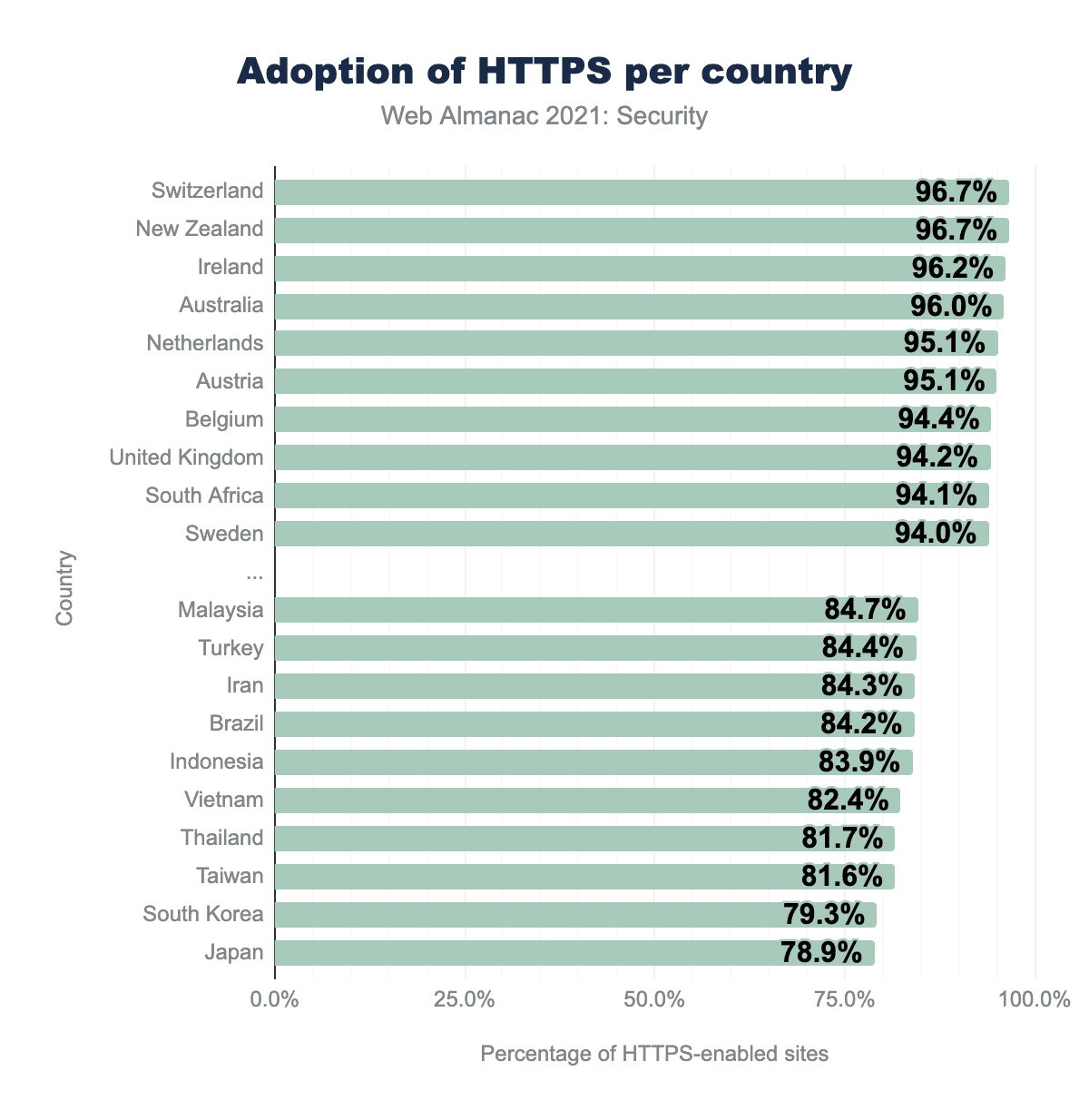 デフォルトでHTTPSを採用するのが全般的に進んでいることがわかりますが、訪問者の出身国によって、サイト間の採用率にばらつきがあります。