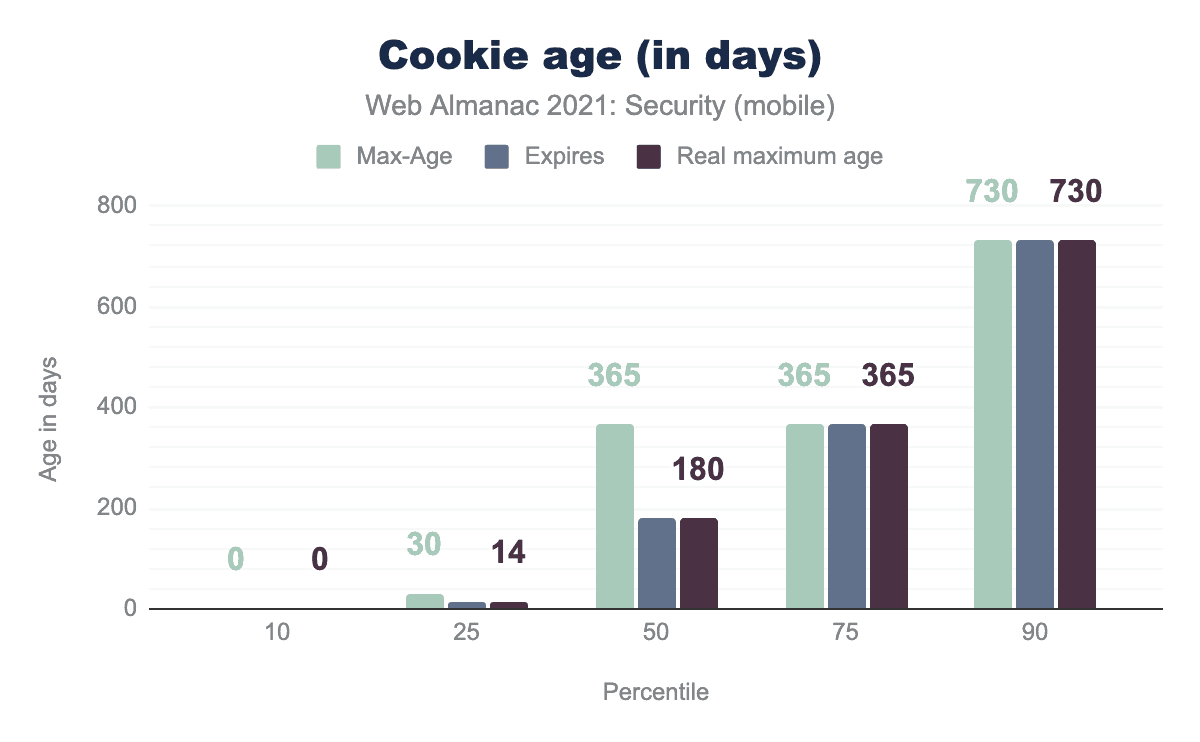Max-Ageが0で、Expiresが0の場合、実際の最大寿命は0のままです。 10パーセンタイルでは、2つの値で30日と14日という値は、実際の寿命が Max-Age を持つクッキーの約20.5%が31,536,000という値を持っていることから、中央値の Max-Age は365日であることがわかります。しかし、ファーストパーティークッキーの64.2%は Expiresを持ち、23.3%は Max-Age を持ちます。クッキーの間ではExpiresがずっと優勢なので、実際の最大寿命の中央値は、期待されるようにMax-AgeではなくExpires(180日)と同じになっています。