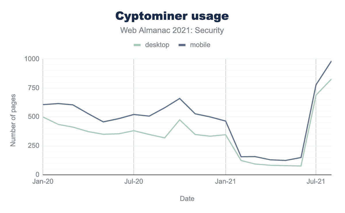 私たちのデータセットによると、最近まで、クリプトマイナーを使用したウェブサイトの数は非常に安定して減少していました。しかし、現在では、そのようなウェブサイトの数が過去2カ月間で10倍以上に増加していることが確認されています。このようなピックは、たとえば、広範なクリプトジャック攻撃が行われたときや、人気のあるJSライブラリが感染したときなど非常に典型的なものです。