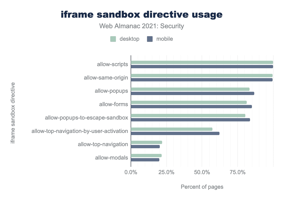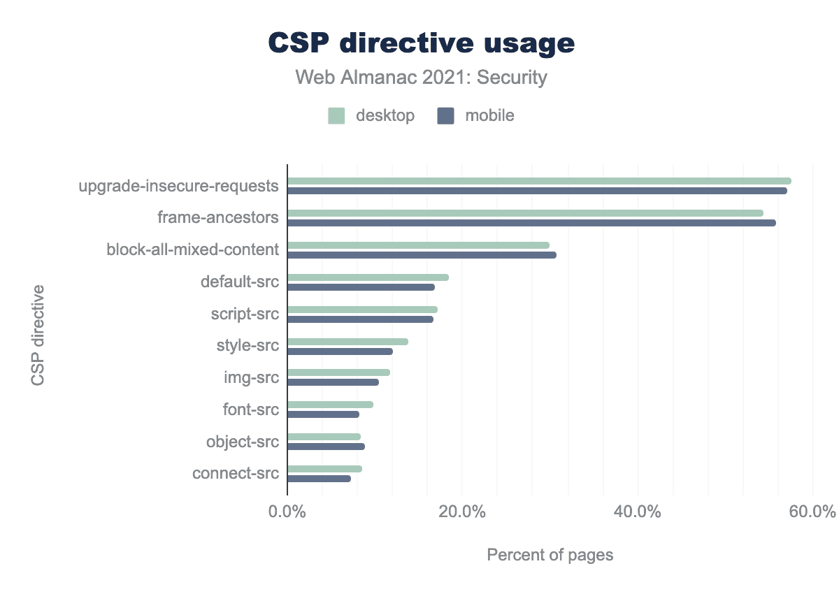 upgrade-insecure-requestsがデスクトップで57.6%、モバイルでは57.1%ともっとも多く、次いでframe-ancestorsがデスクトップで54.4%、モバイルでは55.8%となっています。block-all-mixed-contentはデスクトップで29.9%、モバイルでは30.7%、default-srcはデスクトップで18.4%、モバイルでは16.8%、 script-src はデスクトップで17.2%、モバイルでは16.7%、 style-src はデスクトップで13.8% 、モバイルで12.7%です。 また、 img-src はデスクトップで11.8%、モバイルでは10.4% 、 font-src はデスクトップで9.8%、モバイルでは8.2%、 object-src はデスクトップで8.3%、モバイルでは8.9%、 connect-src はデスクトップで8.5%、モバイルでは7.2% です。モバイル向けホームページでは、昨年の7.2%から9.3%がCSPを使用しており、ますます多くのウェブサイトがCSPを使用し始めていることがわかります。upgrade-insecure-requestsは、引き続きもっとも頻繁に使用されているCSPです。このポリシーの採用率が高いのは、昨年と同じ理由によるものと思われます。これは簡単でリスクの少ないポリシーで、すべてのHTTPリクエストをHTTPSへアップグレードするのに役立ち、またページで使用されている混合コンテンツをブロックするのにも役に立ちます。frame-ancestorsは、ページを埋め込むことができる有効な親を定義するのを助ける、僅差で2番目のものです。