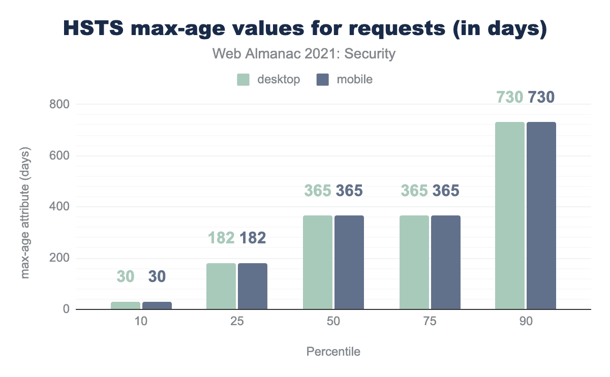 HSTSヘッダーのmax-age属性の中央値は、モバイルとデスクトップの両方で365日であることがわかりました。https://hstspreload.org/ では、HSTSヘッダーが適切に設定され問題が、発生しないことが確認された場合、max-ageを2年間とすることを推奨しています。