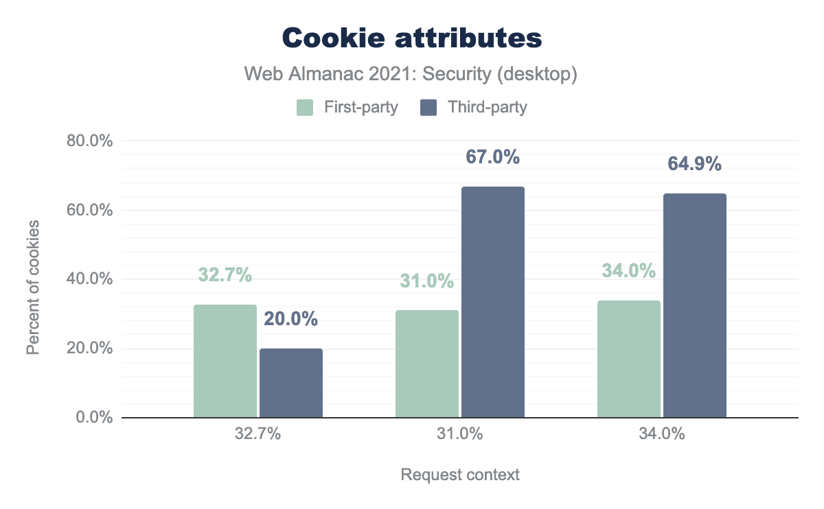 HttpOnly 属性が設定されたクッキーは、JavaScriptの document.cookie APIを使ってアクセスすることができません。このようなクッキーはサーバにのみ送ることができ、クッキーを悪用したクライアントサイドの クロスサイトスクリプティング (XSS) 攻撃を緩和するのに役立ちます。サーバーサイドのセッションにのみ必要なクッキーに使用されます。HttpOnly属性を持つクッキーの割合は、他のクッキー属性がそれぞれ32.7%と20.0%で使用されているのに比べ、ファーストパーティークッキーとサードパーティーの差はより小さくなっています。