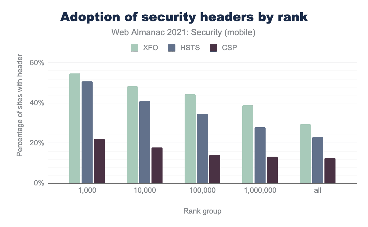 一方では、より多くの訪問者を集めるサイトでより優れた「セキュリティ衛生」を実現すれば、より多くのユーザー(よく知られた信頼できるサイトと個人データを共有する傾向がある)の利益につながるということです。一方、訪問者の少ないサイトでのセキュリティ機能の採用率が低いのは、これらの機能を(正しく)実装するためには、まだかなりの投資が必要であることを示しているのかもしれません。小規模なWebサイトでは、この投資が必ずしも有効であるとは限りません。願わくは、特定のテクノロジースタックで、デフォルトで有効になっているセキュリティ機能がさらに増え、ウェブ開発者がそれほど努力しなくても多くのサイトのセキュリティがさらに強化されることを期待します。