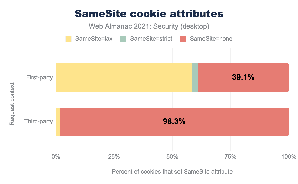 SameSite=laxが58.5%、SameSite=strict2.5%、SameSite=none39.1%、サードパーティではSameSite=laxが1.5%、SameSite=strict0.1%、SameSite=noneは98.3%で使用されていることがわかります。SameSite 属性を持つファーストパーティークッキーの58.5%が Lax に設定されていることがわかります。一方、SameSite 属性が none に設定されているクッキーがまだ39.1% あり、かなり大変ですが、数は着実に減少しています。現在のほぼすべてのブラウザは、SameSite属性が設定されていない場合、SameSite=Laxをデフォルトとしています。ファーストパーティークッキー全体の約65%は SameSite 属性を持っていません。