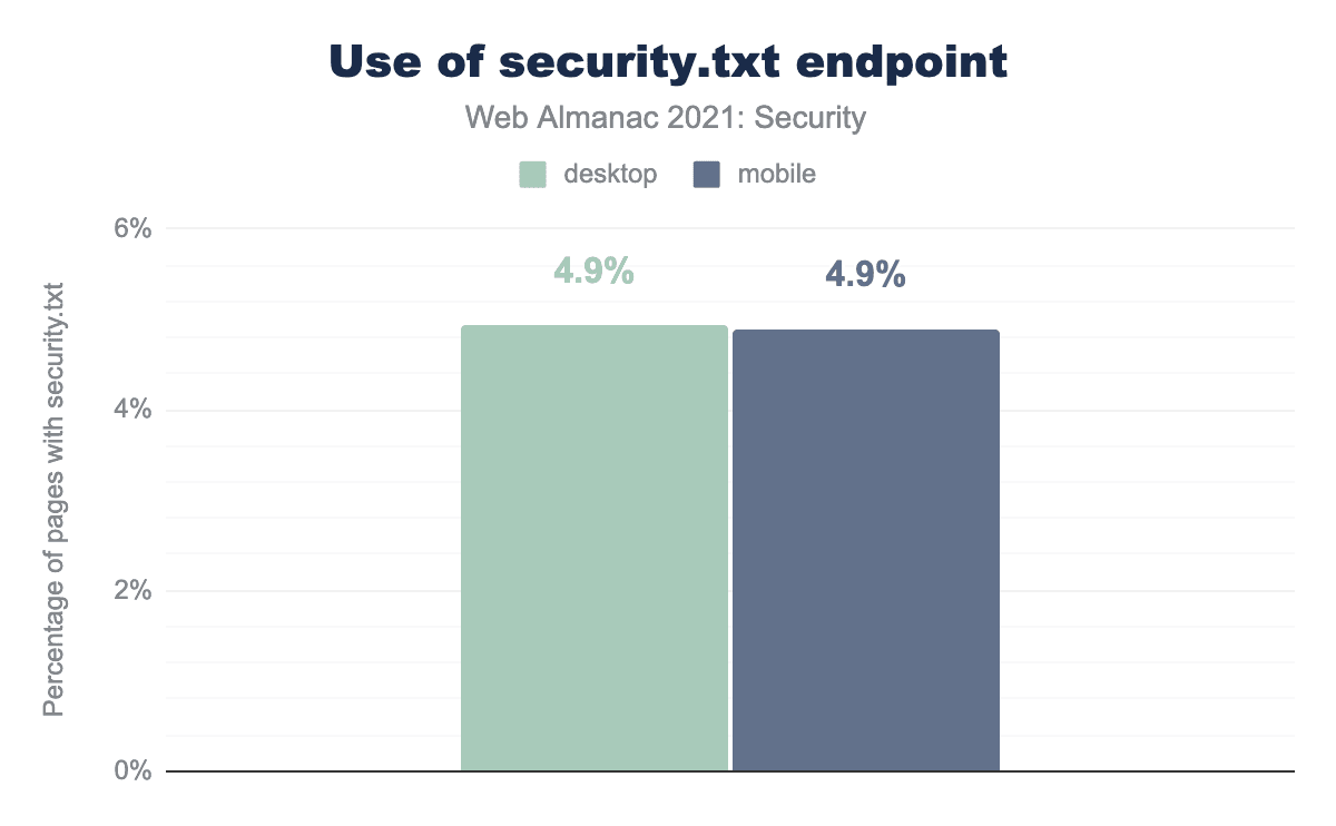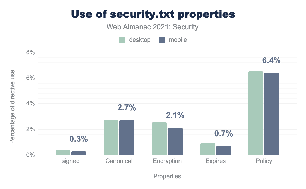 security.txtのさまざまなプロパティの使用を示しています。 デスクトップで0.4%、モバイルでは0.3%の security.txt ファイルが署名されており、Canonical はデスクトップで2.8%、モバイルでは2.7%、Encryption はデスクトップで2.6%、モバイルでは2.1%、Expires はデスクトップで0.9%、モバイルでは0.7%、Policy はデスクトップで6.5% 、モバイルでは6.4% で使用されていることがわかりました。Policy は security.txt ファイルでもっとも使用されているプロパティですが、それでも security.txt のURLを持つサイトの6.4%でしか使用されていないことがわかります。このプロパティには、ウェブサイトの脆弱性開示ポリシーへのリンクが含まれており、研究者が従うべき報告慣習を理解するのに役立ちます。ほとんどのファイルが Policy 値を持つことが予想されるため、このプロパティは security.txt の実際の使用状況のより良い指標となるでしょう。つまり、すべてのサイトのうち、上記の5%ではなく、0.3%に近い数の「本物の」security.txt ファイルが、存在する可能性があるということです。