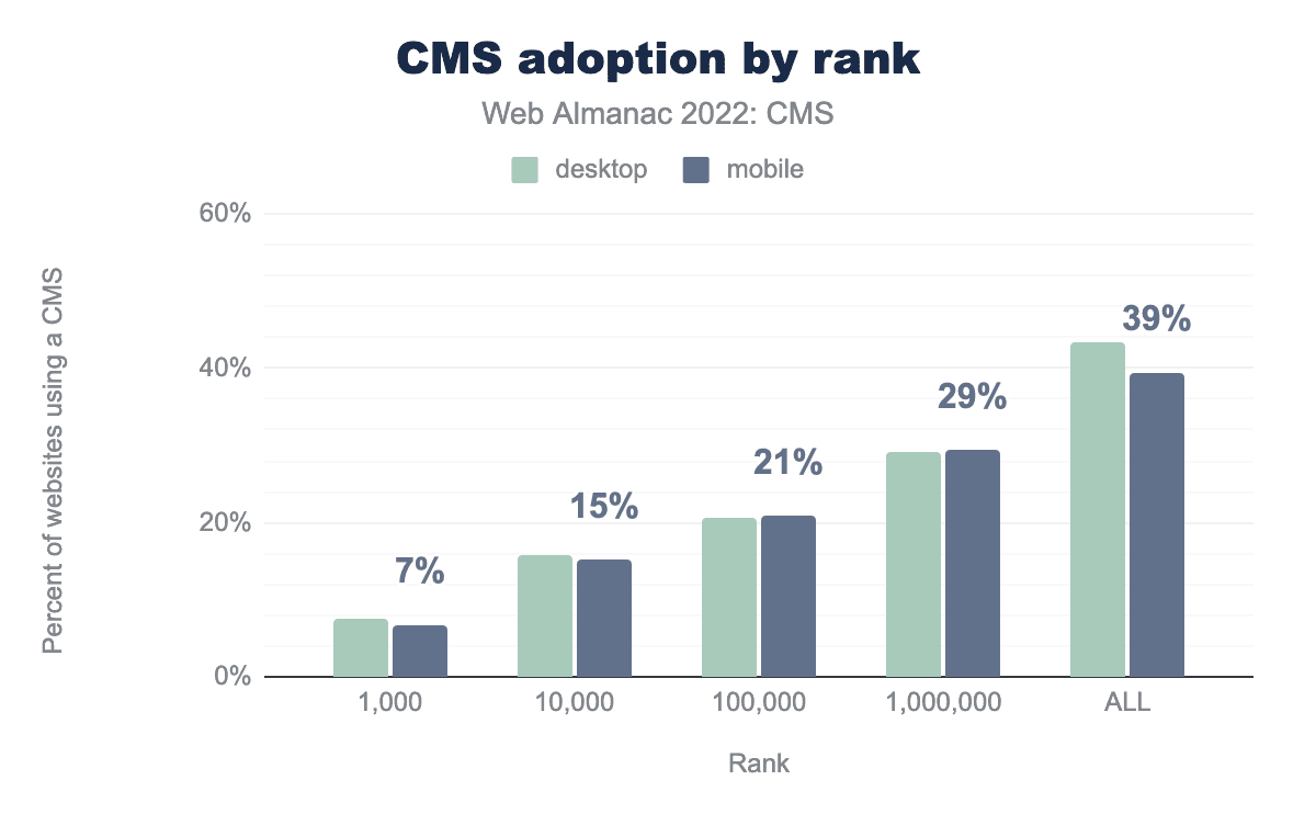 もう1つの説明は、開発に多くのリソースを割り当てられるランクの高いサイトは、セキュリティ上の理由からCMSの特定を隠す傾向があるということです。トップ1,000の90%以上がCMSを完全に使用しないというのはあり得ないことですので、単にデータセットに反映されていないだけである可能性が高いです。