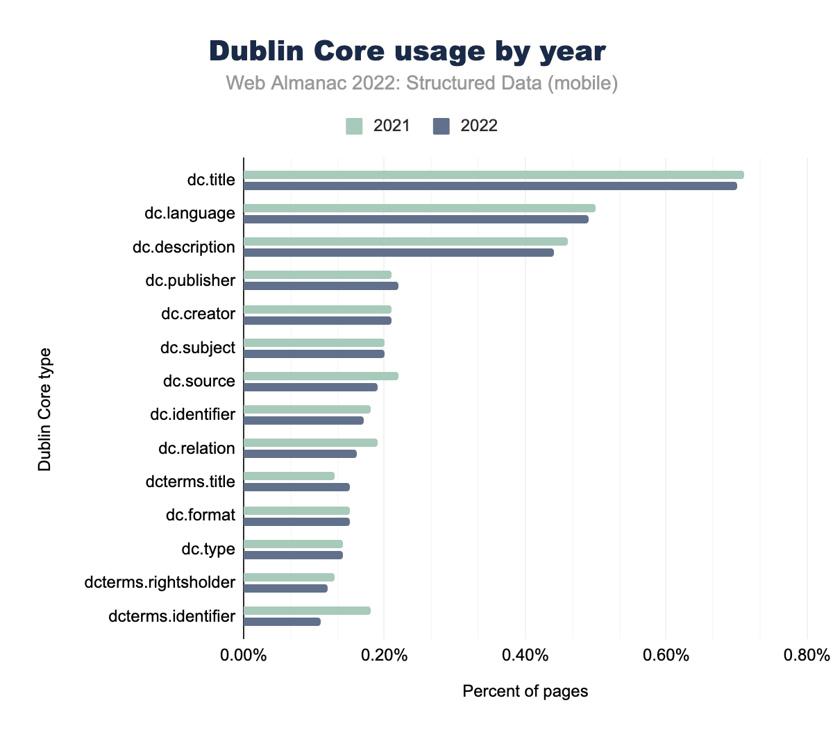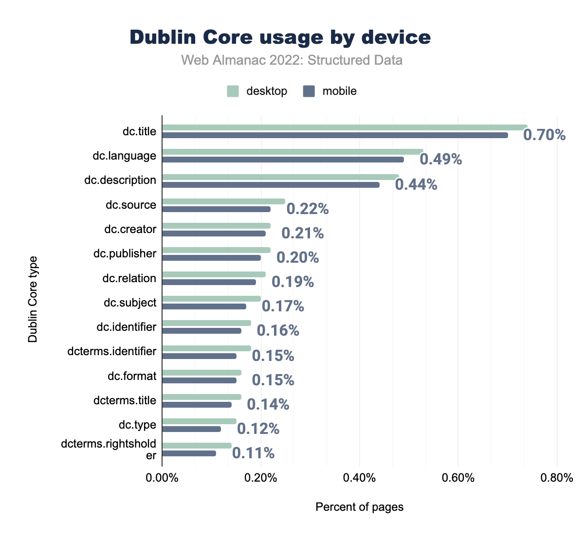 ダブリンコアの属性タイプの使用率は、もっとも顕著な属性タイプで非常によく似たままです。注目すべき例外はdcterms.identifier で、2021年の0.11%から2022年にはモバイルページで0.18%に増加しています。割合としては小さいですが、これは私たちのセットで合計すると約15,000の使用回数になります。この増加は、デスクトップ・ページでも見られましたが、それほど大きくはなく、2021年の0.14%から2022年の0.18%になりました。
