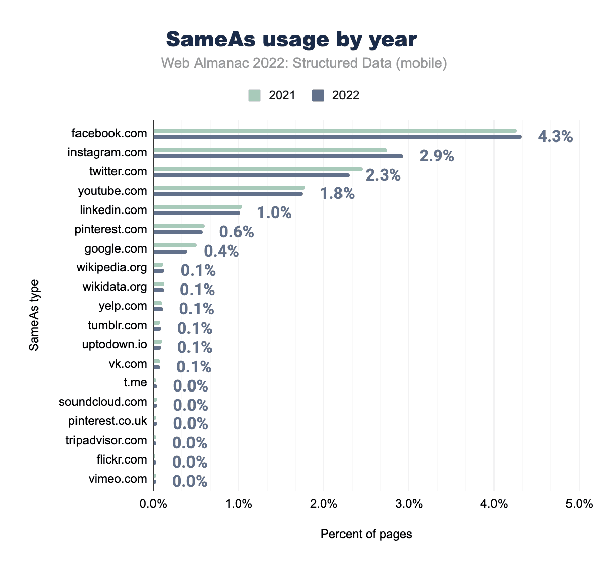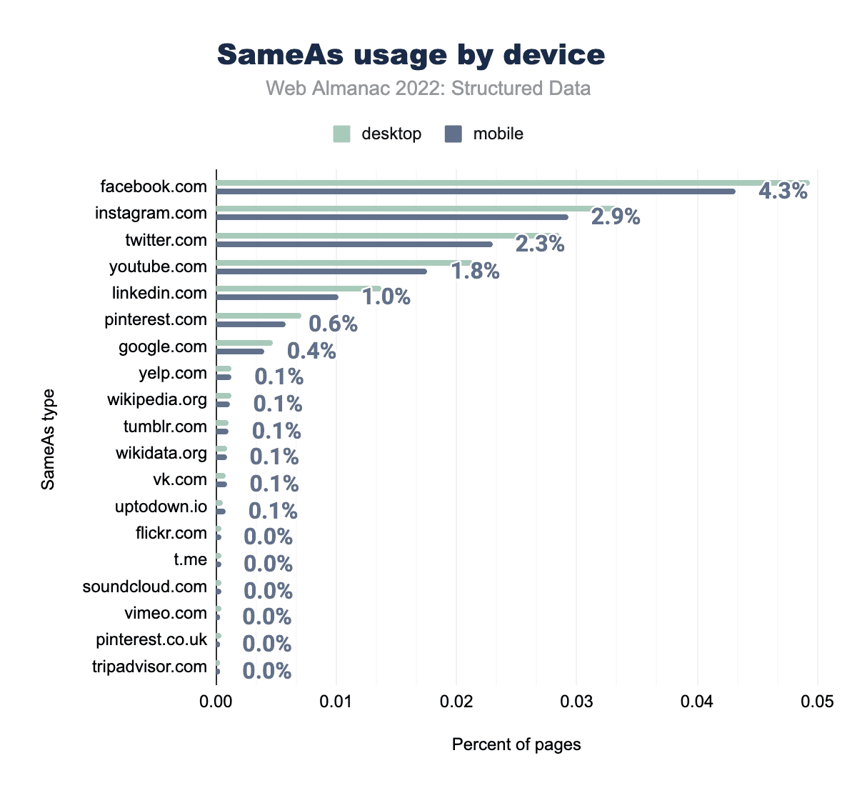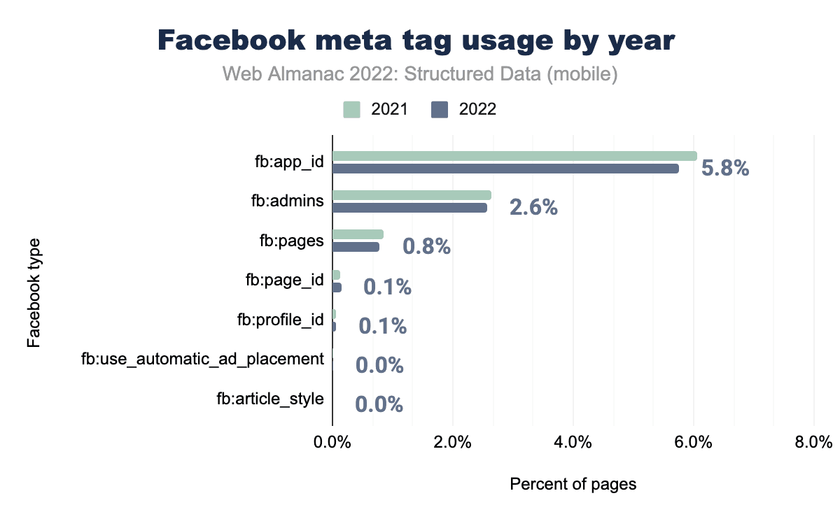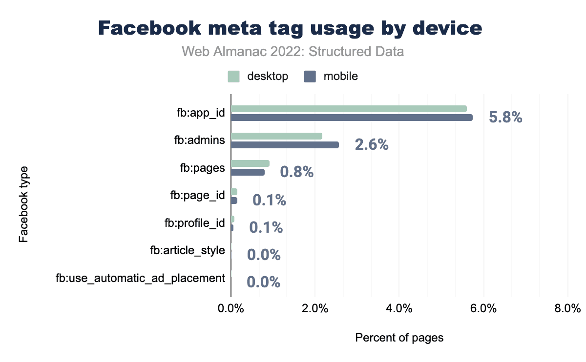 ここにあるすべてのFacebookタグのうち、出現数が多いのは3つだけです。これらは2021年の上位3つと同じで、fb:app_idが5.8%、fb:adminsは2.6%、モバイルではfb:pagesが0.8%と、いずれも昨年より微減しています。