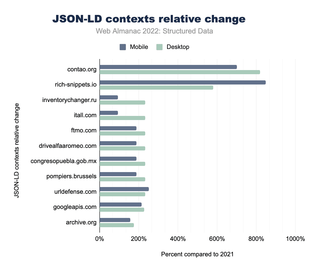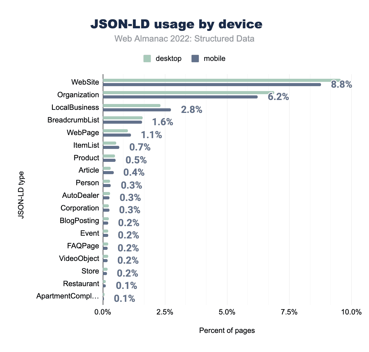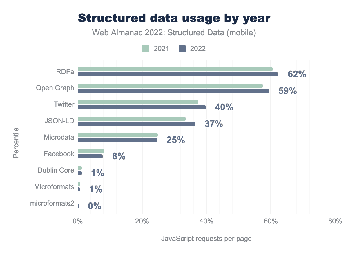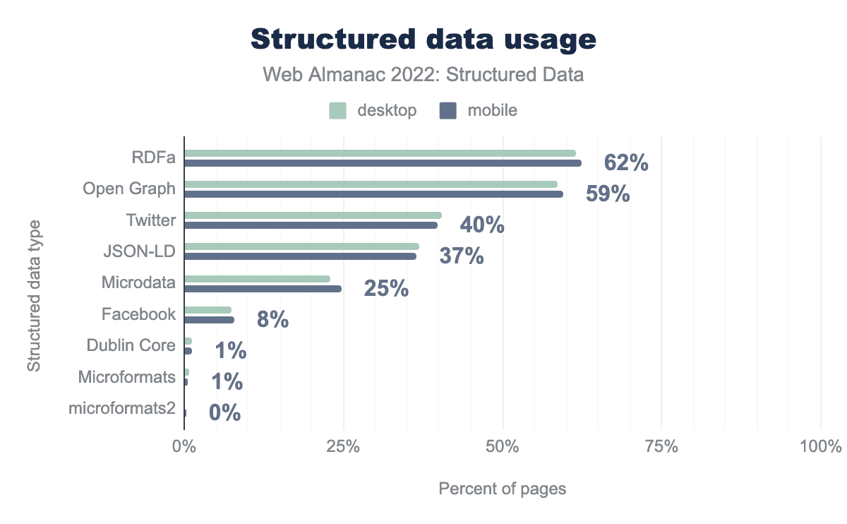 Twitterメタタグ(37%から40%に増加)やJSON-LD(2021年の全体34%から2022年の全体37%にカバー率が増加)など、これらの広く使われている構造化データ型の全般的な増加が見て取れる。Microdata、Facebook meta tags、Dublin Core、Microformatsなど、あまり普及していない構造化データ型については、利用率がやや減少しています。デスクトップの動きも非常に似ています。