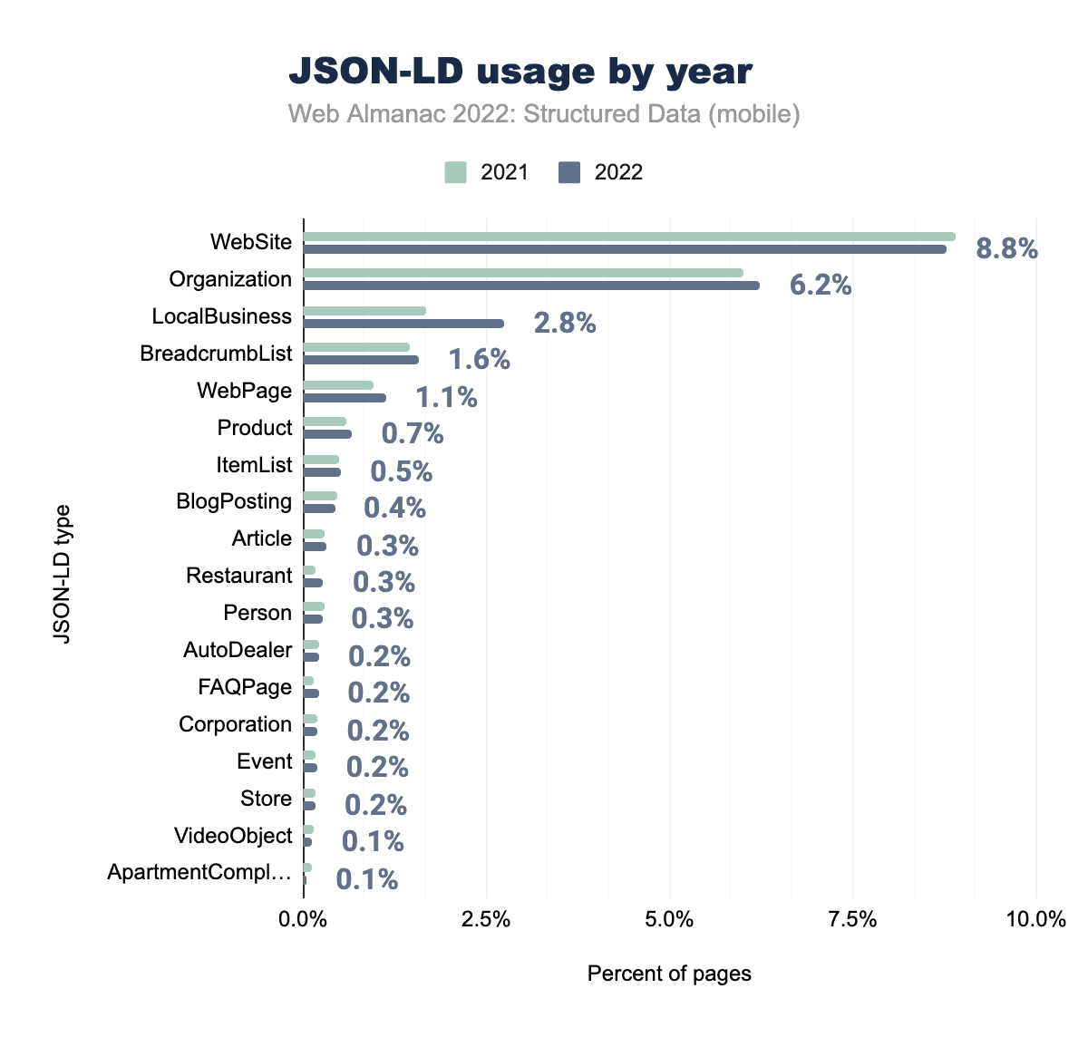 JSON-LDのタイプは、前年と比較していくつかの顕著な増加があるものの、ほぼ同様の傾向が続いています。とくに、LocalBusiness(セット内のページの2.8%に増加)とRestaurant(セット内のページの0.3%に増加)が挙げられます。