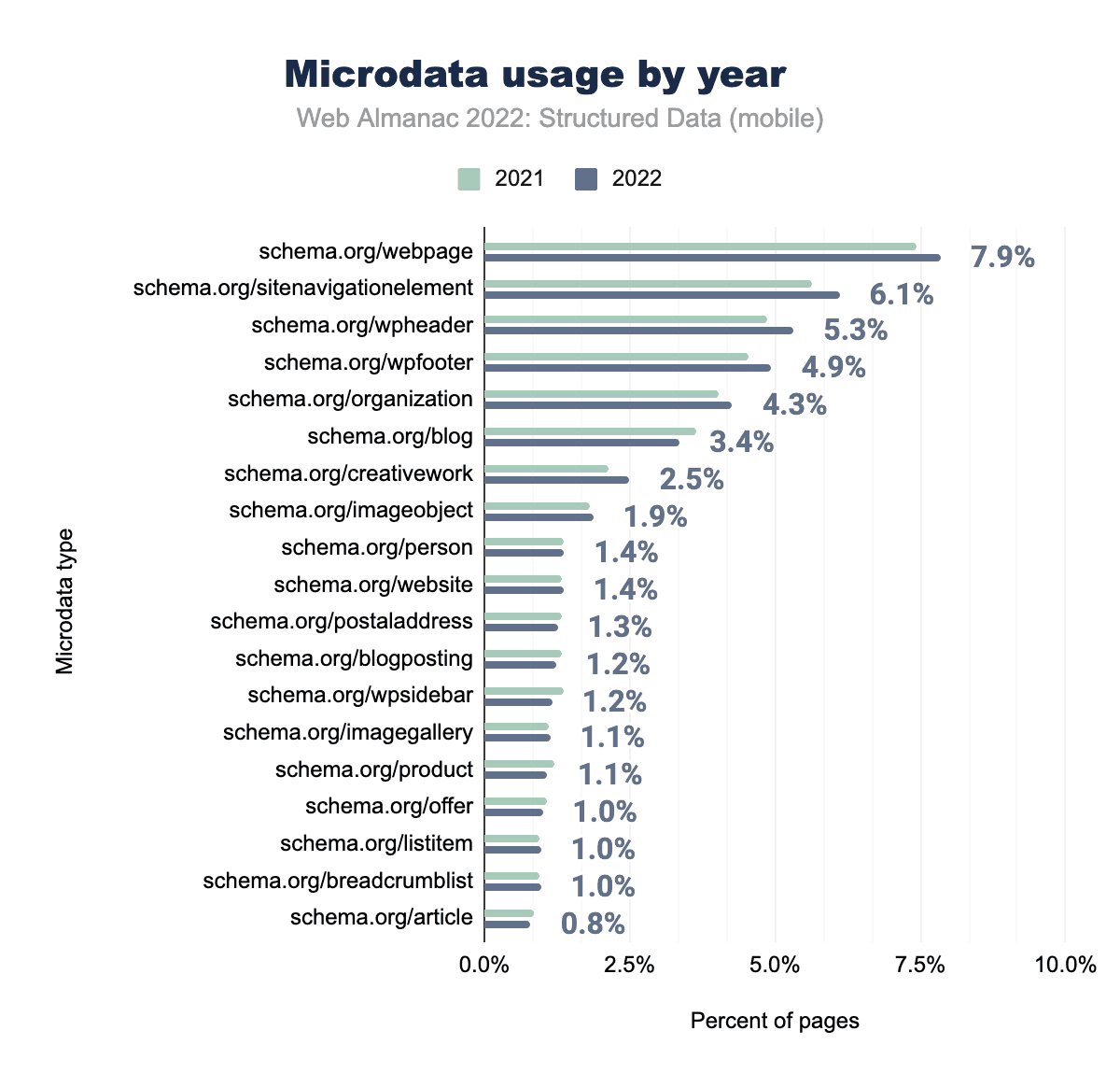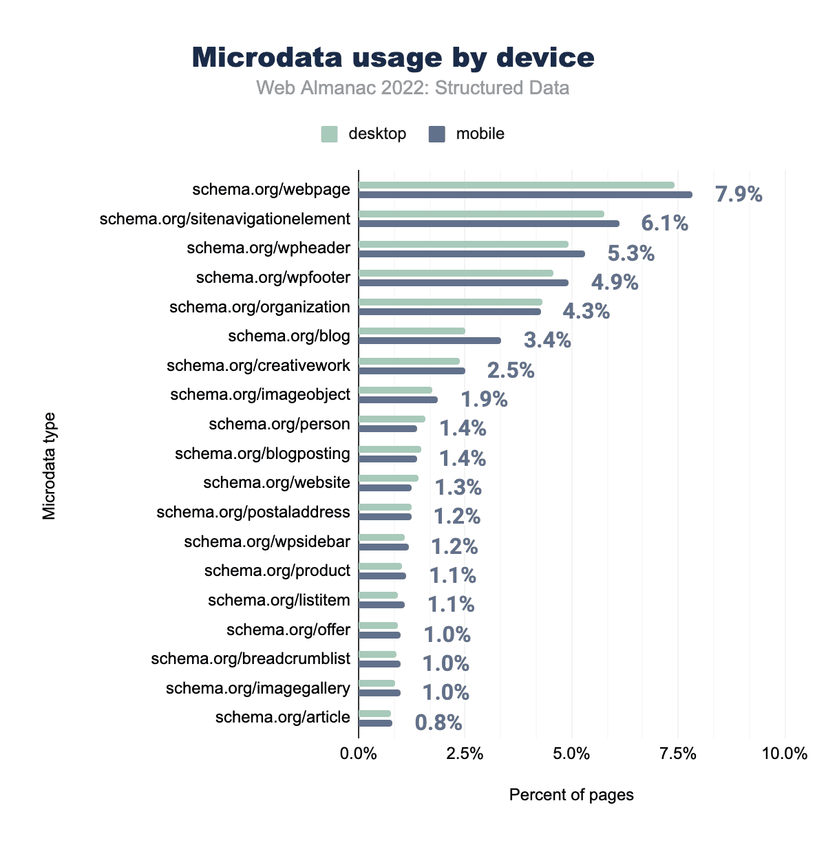 マイクロデータのプロパティのほとんどはあまり変化していませんが、webpagesitenavigationelementwpheaderといったより一般的なプロパティは、それぞれモバイルページの7.9%、6.1%、5.3%に表示されており、若干の増加が見られます。