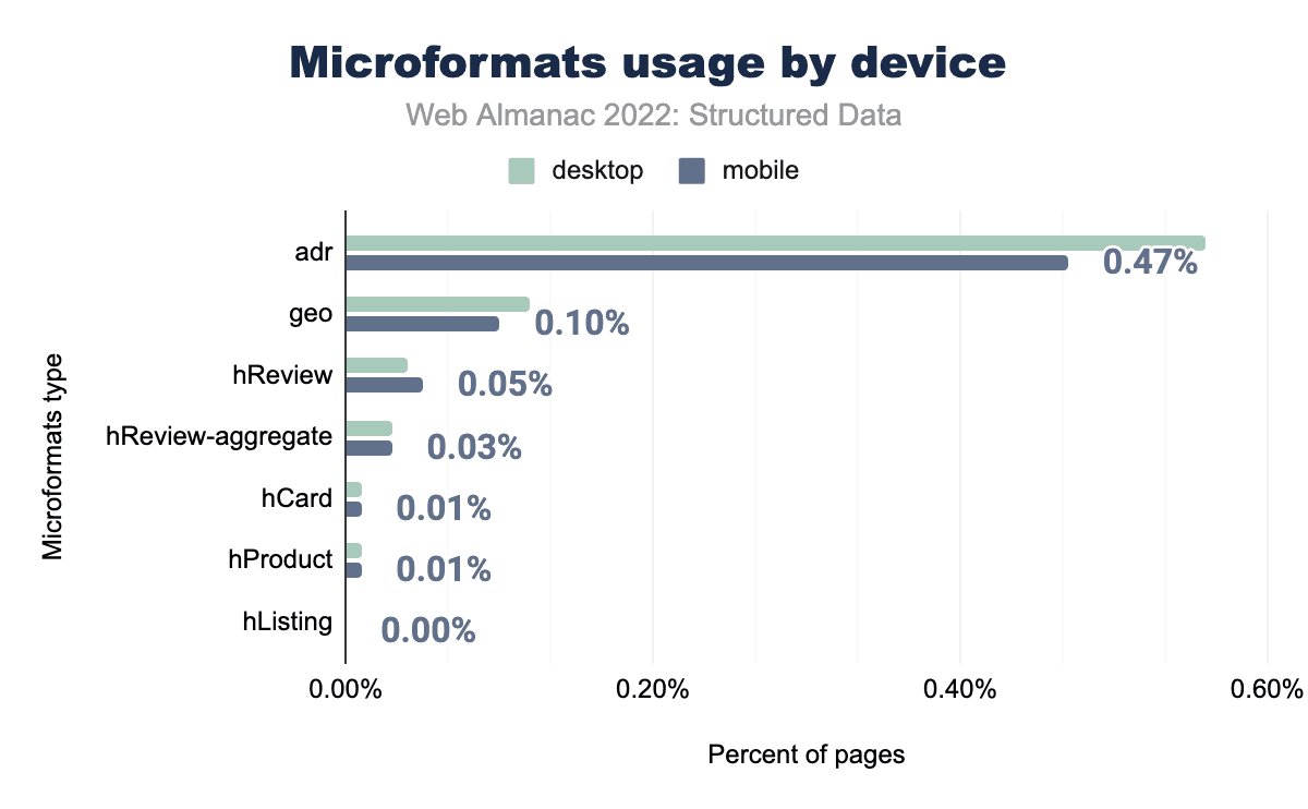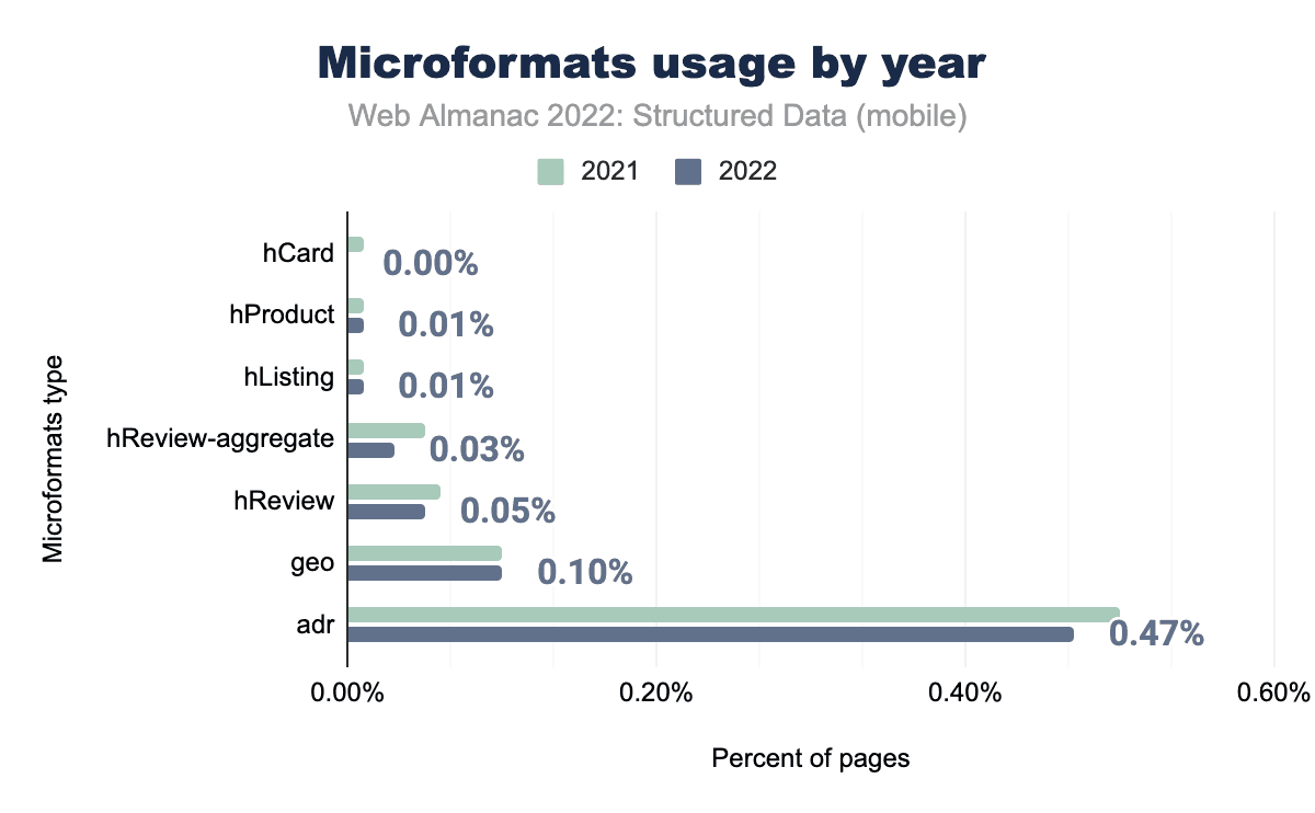 マイクロフォーマットは、2021年以降、使用法の数はもっとも一般的なもので、adr(私たちのセットの0.47%のページに出現)は、依然としてリストの中でもっとも一般的なものです。