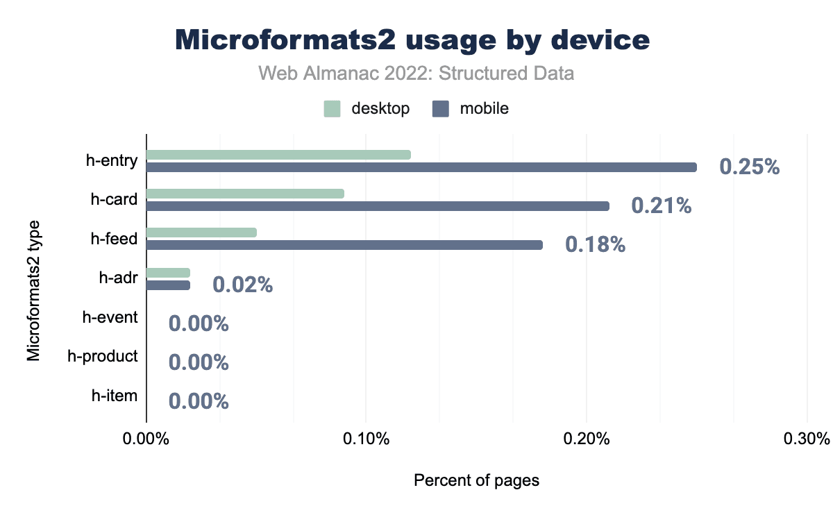 RDFaとOpen Graphは、それぞれモバイルページの62%と57%を占めており、依然として大多数を占めています。構造化データ型はモバイルとデスクトップのページで一貫して見られますが、Microformatsとmicroformats2はこの章で調べた他の構造化データ型ともっとも異なっています。Microformatsはモバイルページで86%著しく、一方microformats2はモバイルページで171%著しくなっています。これらの2つの構造化されたデータ・タイプは、私たちのセットで見つかったものの小さな割合を構成しています。