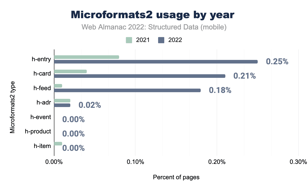 一方、2021年以降、マイクロフォーマット2の属性は急増しています。h-entryh-cardh-feedのプロパティは、我々のページのセットで大きな増加を示しており、これはマイクロフォーマット2の属性が前年からほぼ3倍になったことを説明するものです。