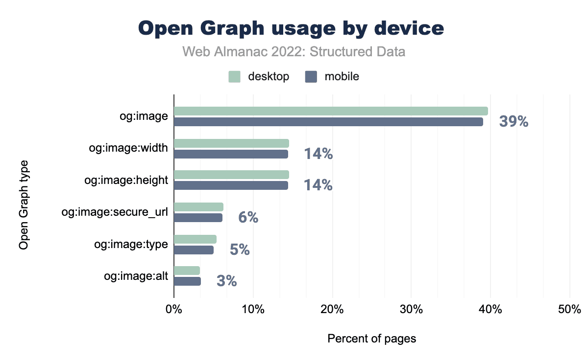 Open Graphタグは、広く使用されるようになりました。これらのタグのうちもっとも一般的なのは、og:titleであり、og:urlog:typeとともに、セット内の全ページの半数以上に出現しています。もっとも多くの増加幅は小さく、例外的に og:image:type は2021年以降、モバイルページで3倍以上になっています。これはデスクトップでも同様で、1年の間に1.6%から5.4%になりました。
