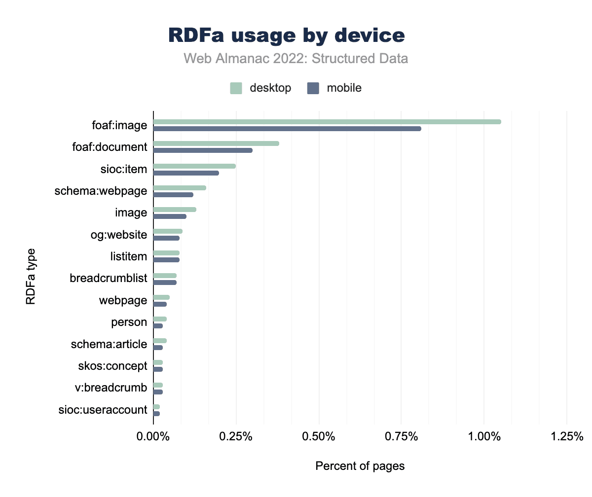 RDFaはデスクトップでより顕著で、foaf:imageはモバイルページの0.81%に対し、デスクトップページの1%に出現しています。その他のRDFaタイプは、モバイルよりもデスクトップページでの出現率がわずかに上昇しましたが、og:websiteは例外で、モバイルページでは0.08%、デスクトップページは0.07%で先に到達しています。