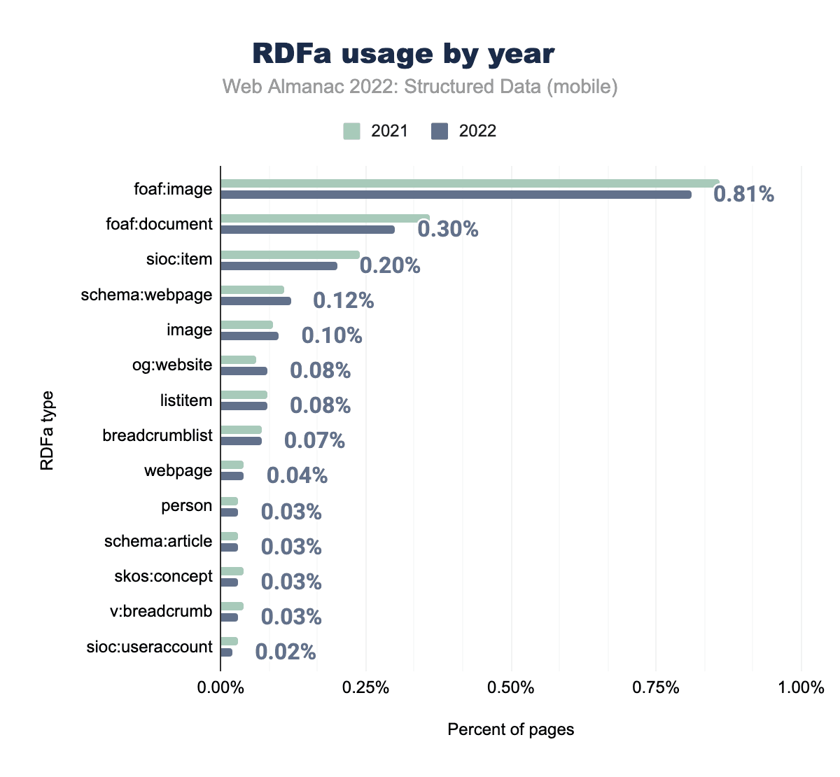 RDFaのタイプを評価すると、foaf:imageは他のどのタイプよりも多くのページに存在していますが、2021年以降、セットに含まれるページの割合が減少していることがわかります。これは次の2つのタイプ、foaf:documentsioc:itemにも当てはまり、使用率がわずかに減少しています。他の多くのタイプは、RDFaが全体として見ているように、使用率がわずかに増加していることがわかります。