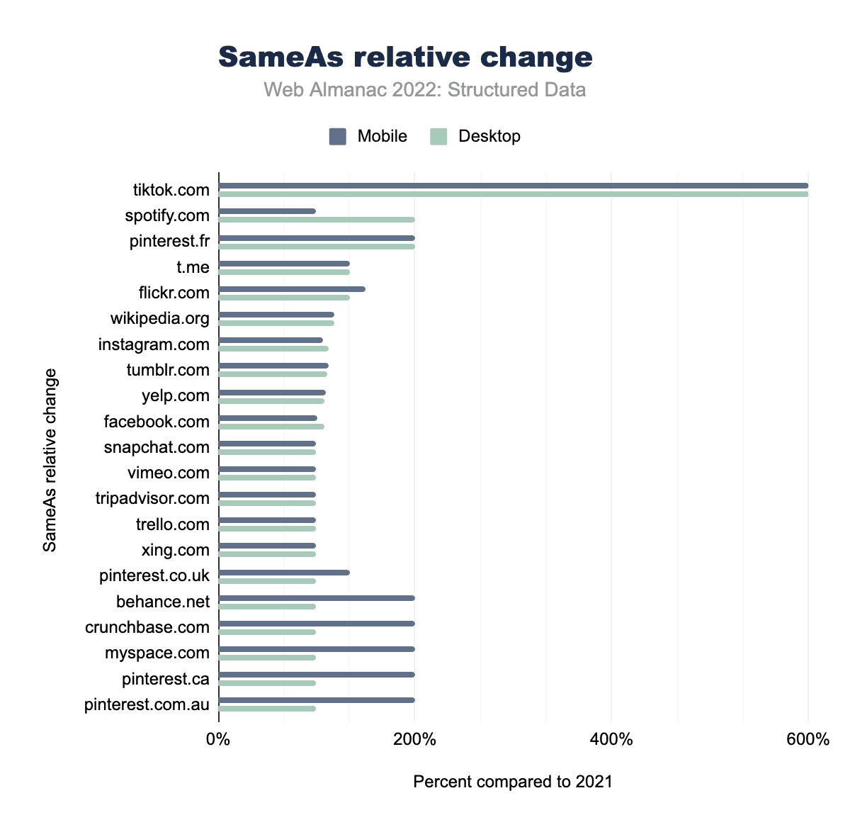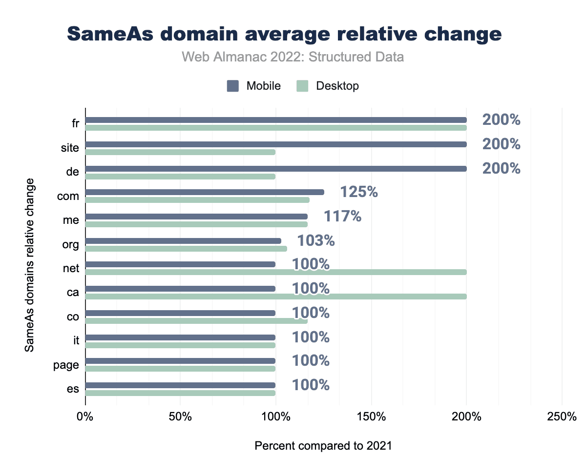 また、SameAsの項目とその経時的な変化も興味深い。TikTokは、2021年と比較して、2022年は6倍ものページで表示され、大幅な増加を示しています。この変化は、デスクトップとモバイルの両方のページで同じです。Pinterestとそのドメイン名は、2022年にモバイルページでもっとも多く増加した上位5つのうち3つを占めています。モバイル全体では、デスクトップよりもSameAsエントリーの増加が大きいですが、Spotifyは例外で、デスクトップページの出現数が2021年と比較して2倍になっています。
