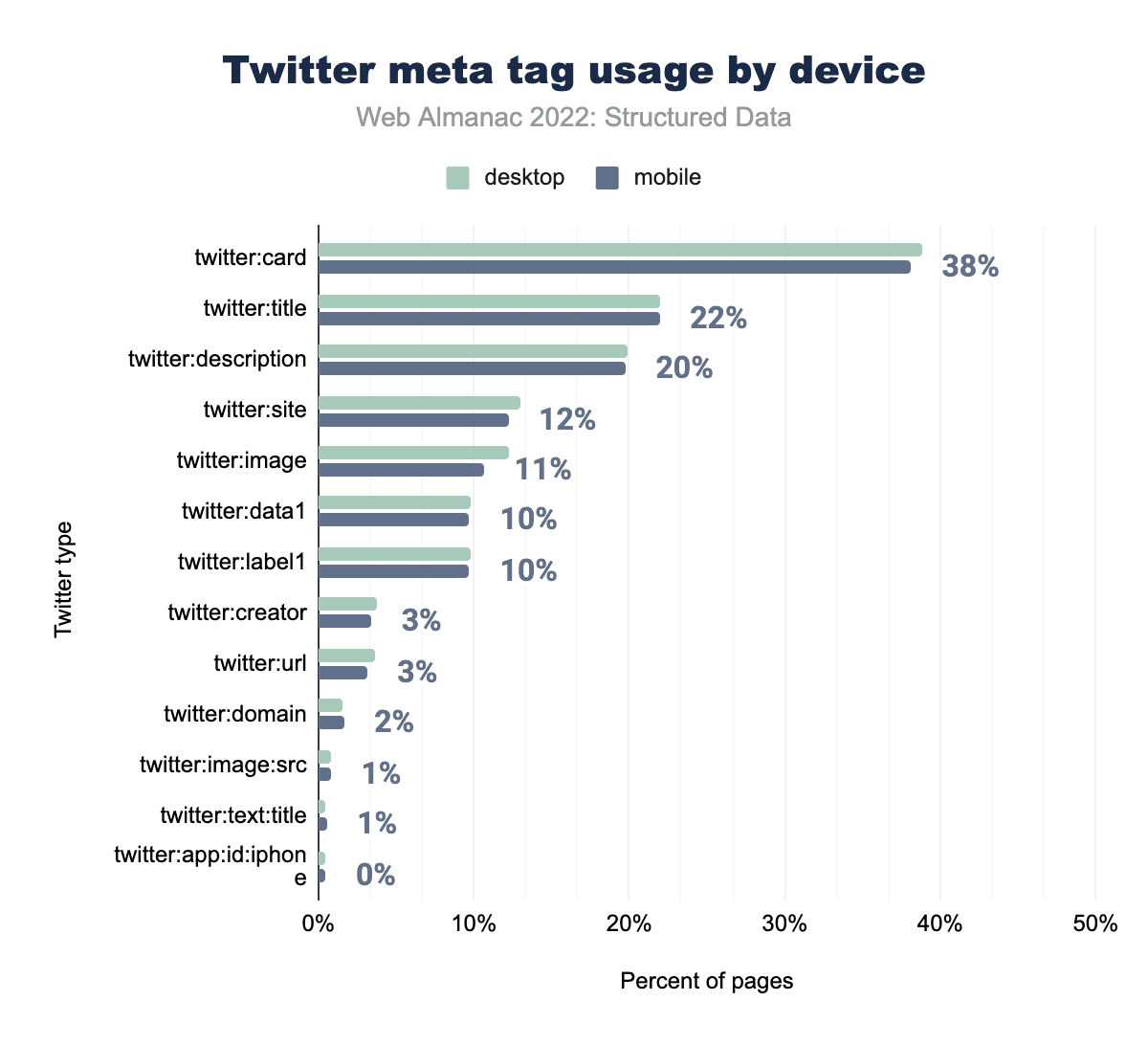 twitter:sitetwitter:imageなどのTwitterメタタグは、デスクトップサイトでより大きな存在感を示していますが、これらのメタタグの大半はモバイルとデスクトップの間、また前年比で同じ普及率を示しています。あまり一般的でないタグの中には、今年、使用率がわずかに減少したものもありますが、Twitterのメタタグの使用率は昨年から全体的に増加を維持しています。
