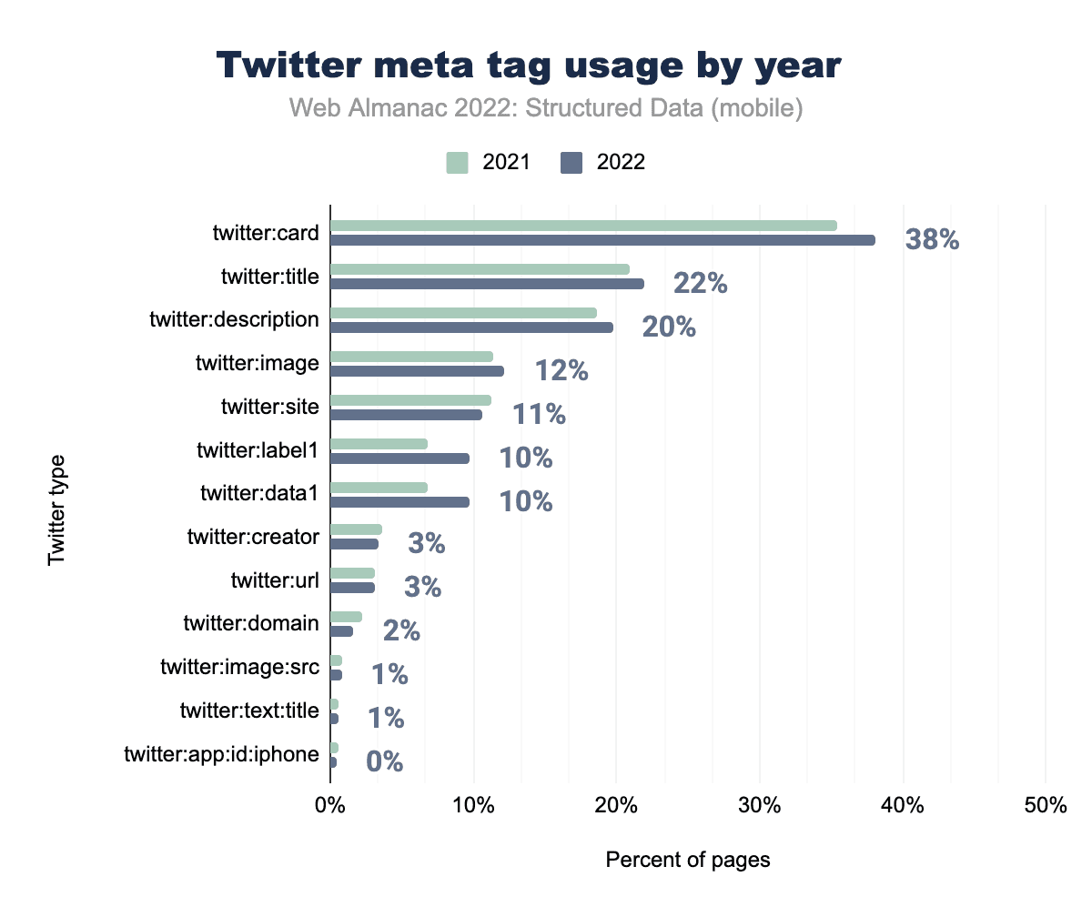 Twitterのメタタグは再び、一般的な使用率の増加パターンにしたがっており、とくにtwitter:cardtwitter:titletwitter:descriptiontwitter:imageの共通タグで増加しています。注目すべきは、twitter:label1twitter:data1で、ともに2021年の7%から2022年にはモバイルページで10%に増加していることが確認できます。