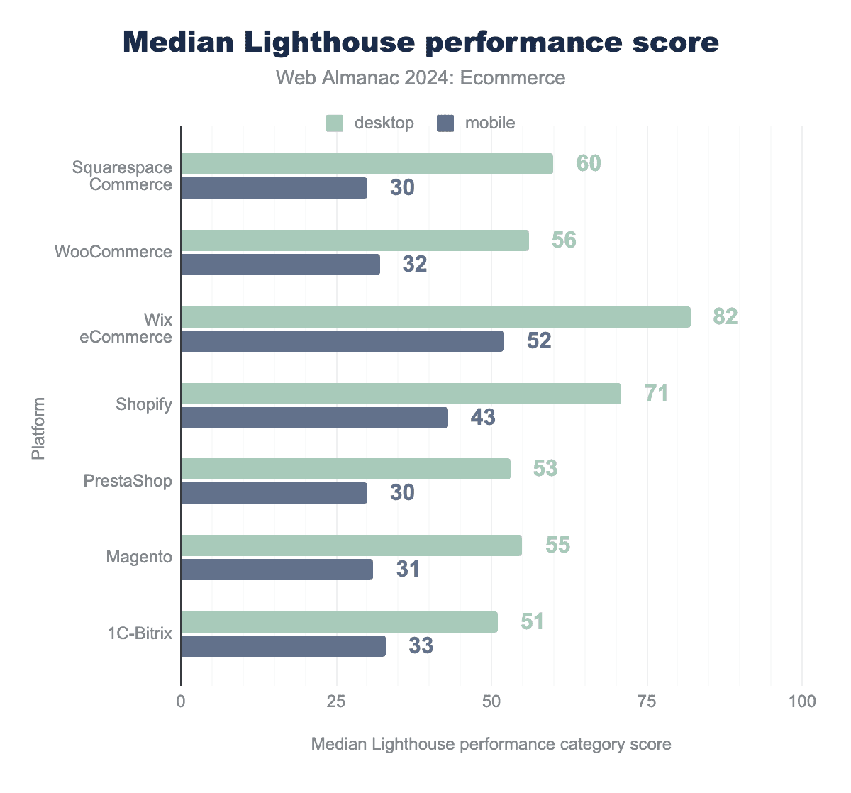 Wix ecommerceが他のシステムと比較して、デスクトップとモバイルの両方で非常に優れたパフォーマンスを発揮していることがわかります。これは、ランキングデータが、上位1,000万以外のウェブサイトで主に使用されており、専門的でない店舗である可能性が高いことを示しているため、驚くべきことです。このパフォーマンスは、WooCommerceのようなオープンソースシステムと比較して、カスタマイズオプションが限られていることにも起因する可能性があります。