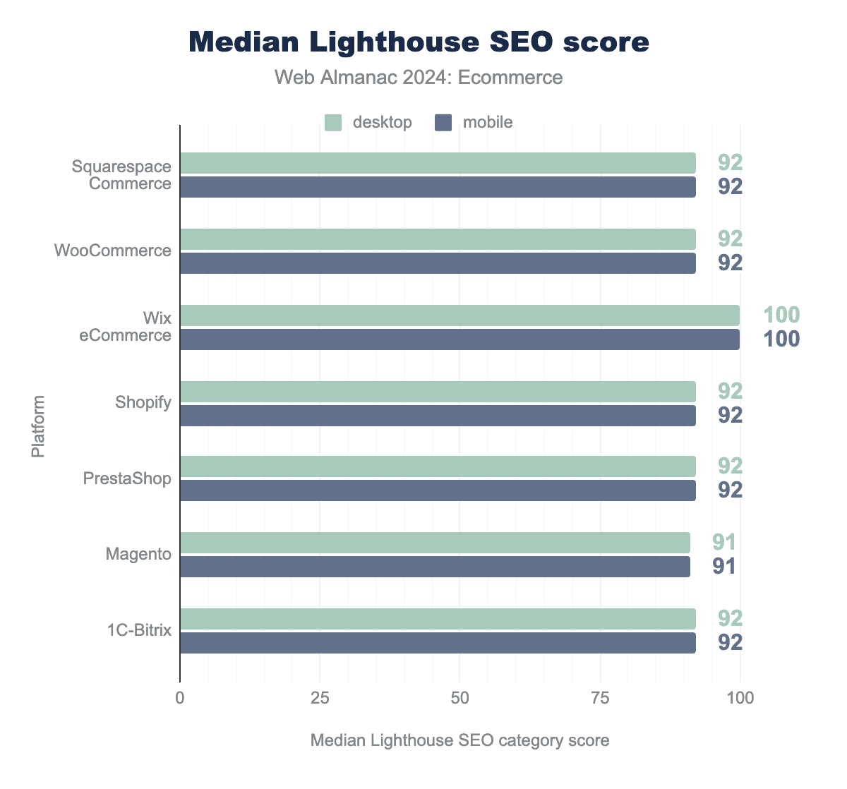 SEOの重要性はLighthouseの結果に反映されており、ほとんどのプラットフォームが非常に良いスコアを記録しています。その中でもWixは中央値スコア100点を記録し、トップに立っています。