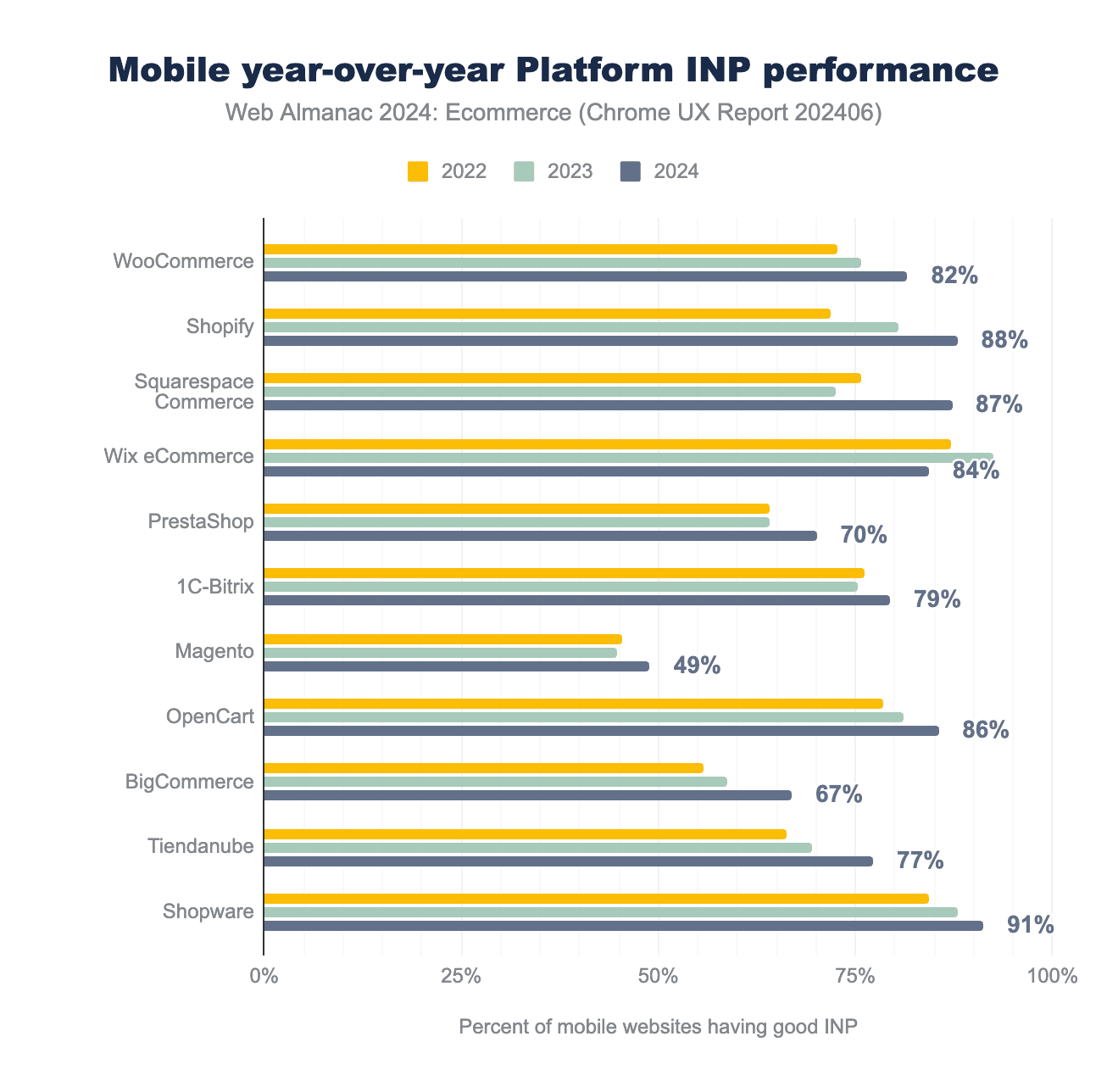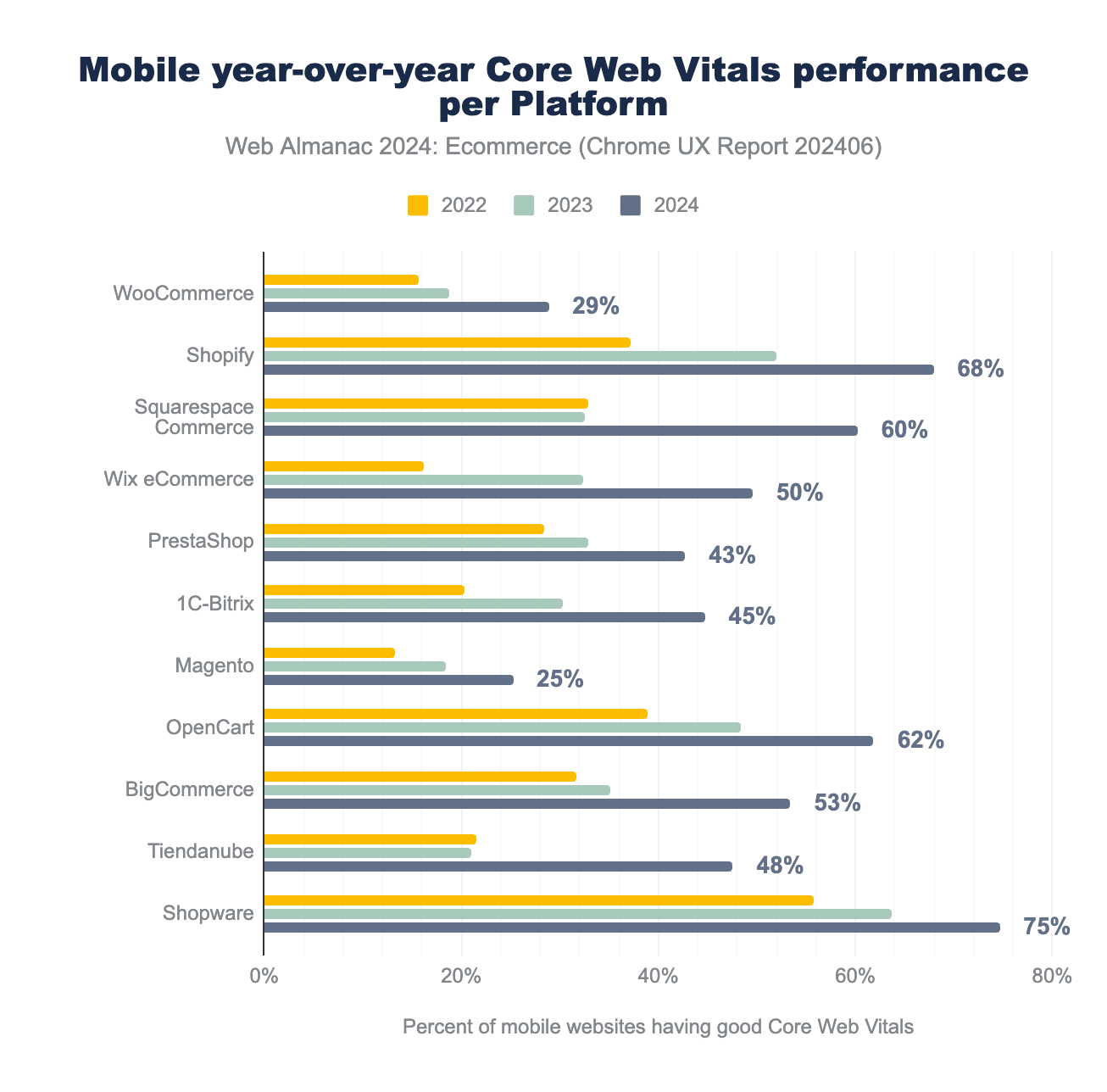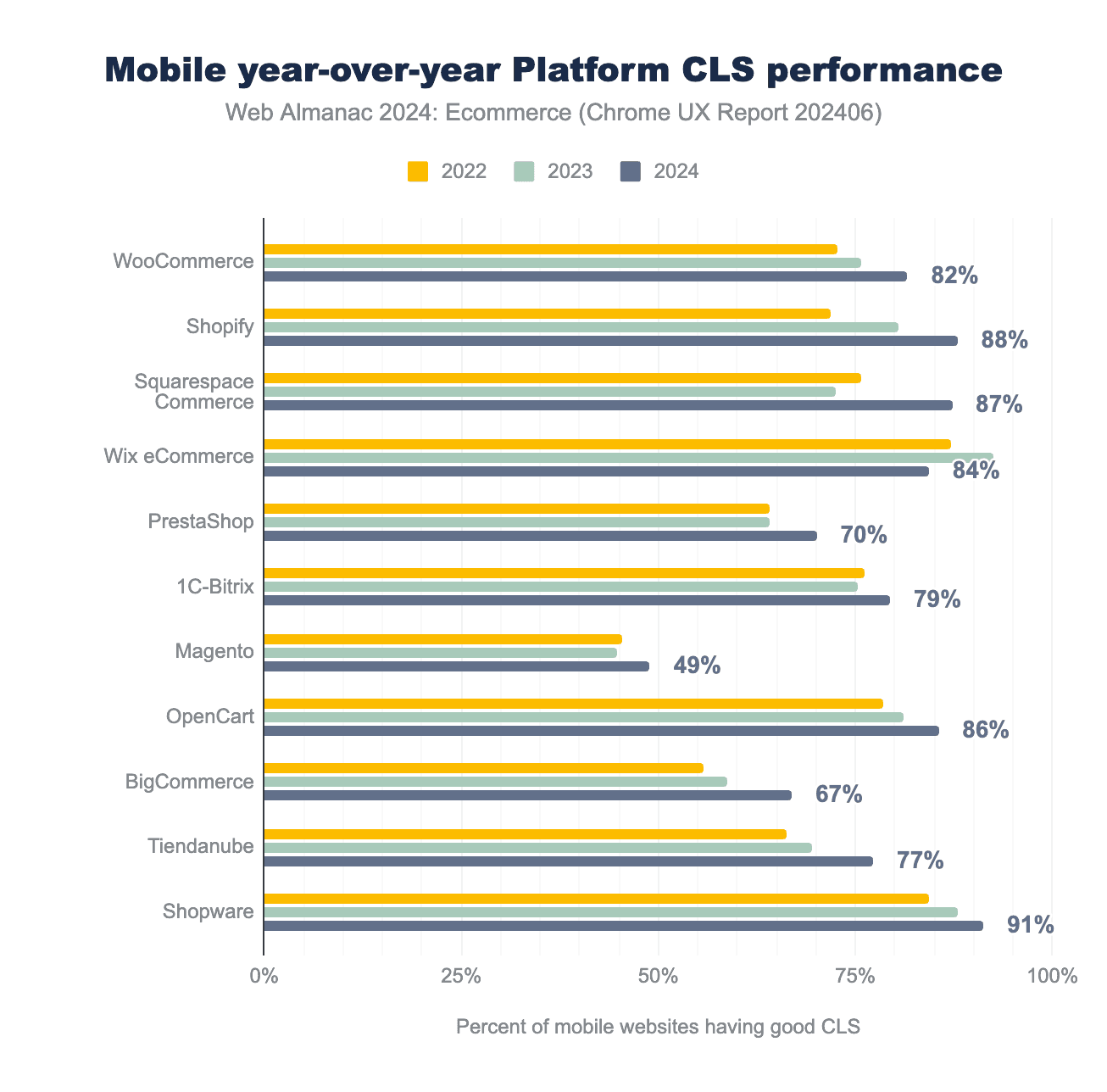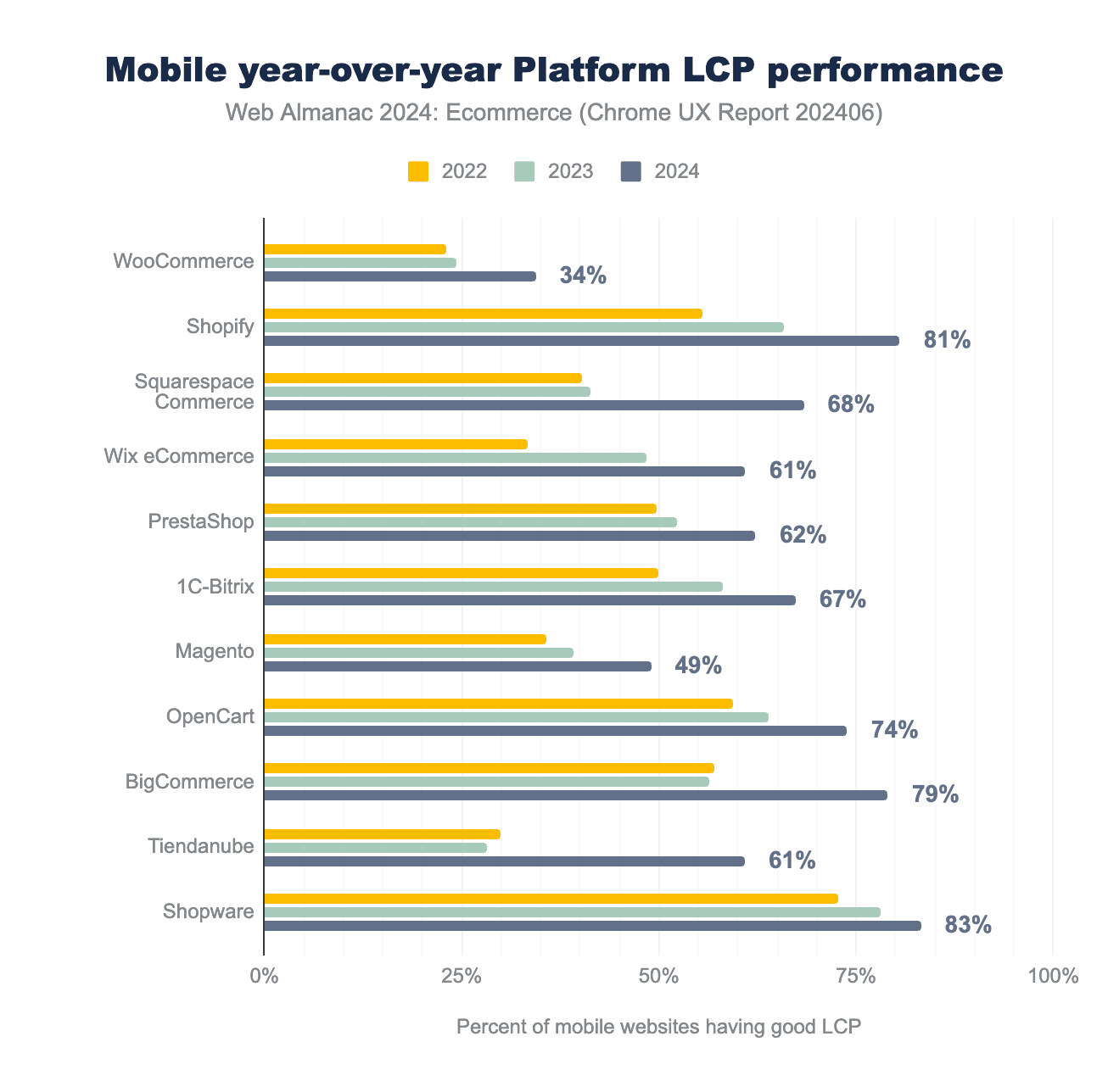 Squarespaceのように、2022年の良好スコア33%から2024年には60%に増加するなど、目覚ましい改善を遂げたプラットフォームもあります。MagentoやWooCommerceのような他のプラットフォームは、依然として実世界のユーザー体験に苦戦しています。このグラフやこのセクションの他のグラフは、ウェブトラフィックのほとんどがモバイルからであり、トップスコアに到達するのがより困難であるため、モバイルのパフォーマンスのみを考慮しています。