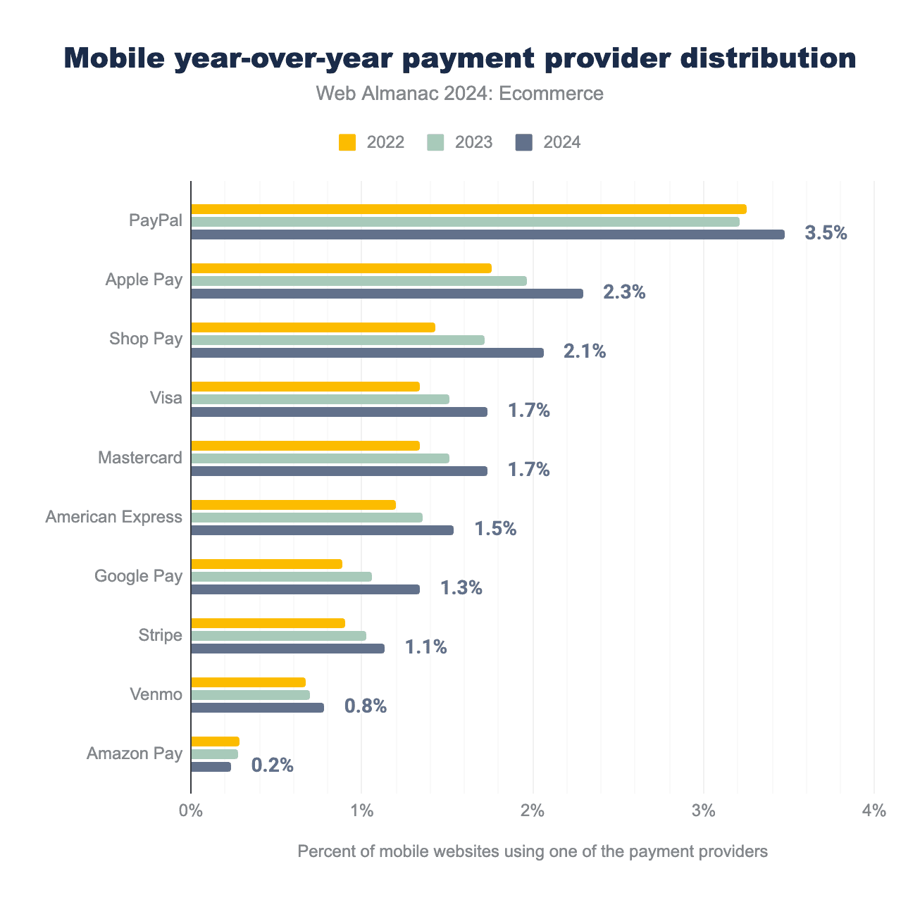 Apple Payは2位にランクされ、Google Payよりも頻繁に検出されており、モバイルEコマースでの存在感が高まっていることを示しています。一方、Shopifyが提供する決済ソリューションであるShop Payは、ランキングで3位を確保しています。