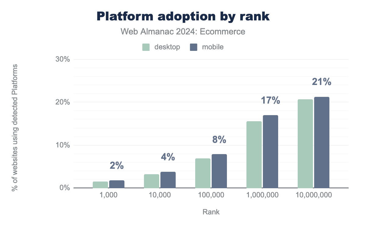 私たちのデータによると、上位1,000のウェブサイトではごく少数のEコマースプラットフォームしか利用されていませんが、上位1,000万のウェブサイトの約20%がEコマースプラットフォームを利用しています。この差は、上位1,000のサイトがカスタムソリューションを利用することが多いためと考えられます。