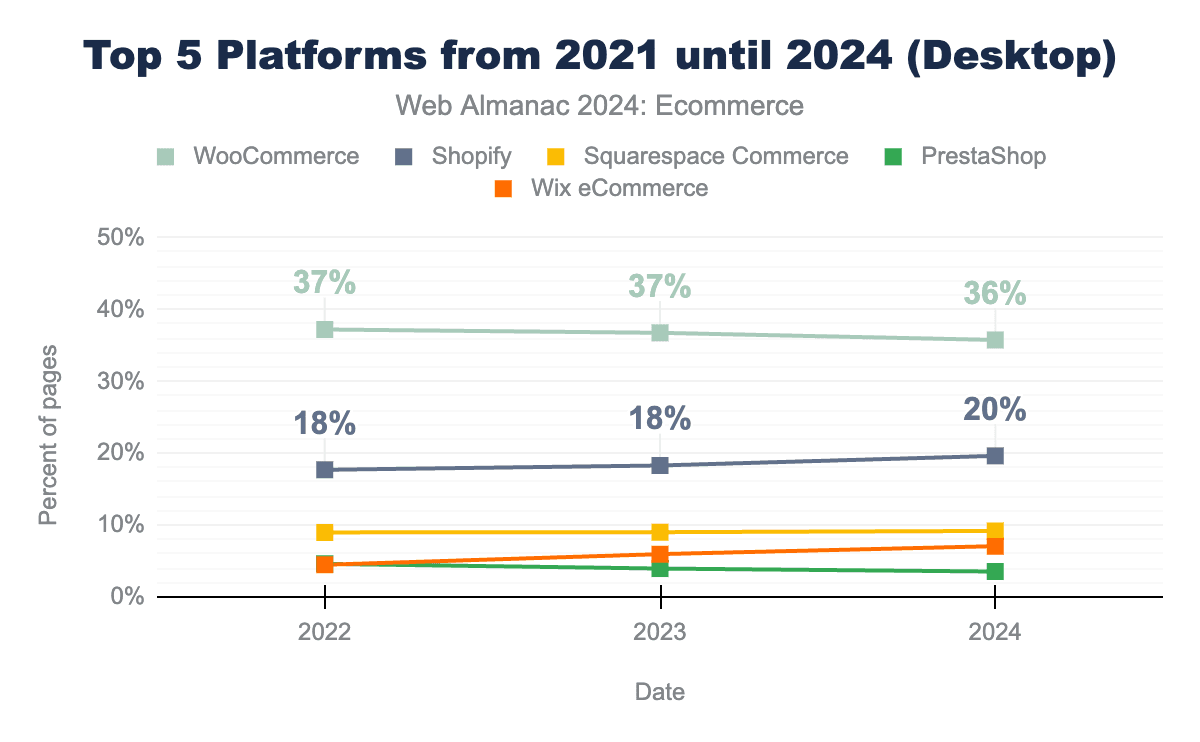 長年にわたり、上位5つのプラットフォームは比較的一貫しています。しかし、Wix ecommerceは2023年にPrestaShopを上回り、5位から4位に浮上しました。トレンドとしては、オープンソースプロジェクトのWooCommerceがわずかに市場シェアを失い、2022年の37%から2024年には36%に減少している一方、その商業的な競合であるShopifyは同期間に市場シェアを伸ばしています(18%から20%に増加)。