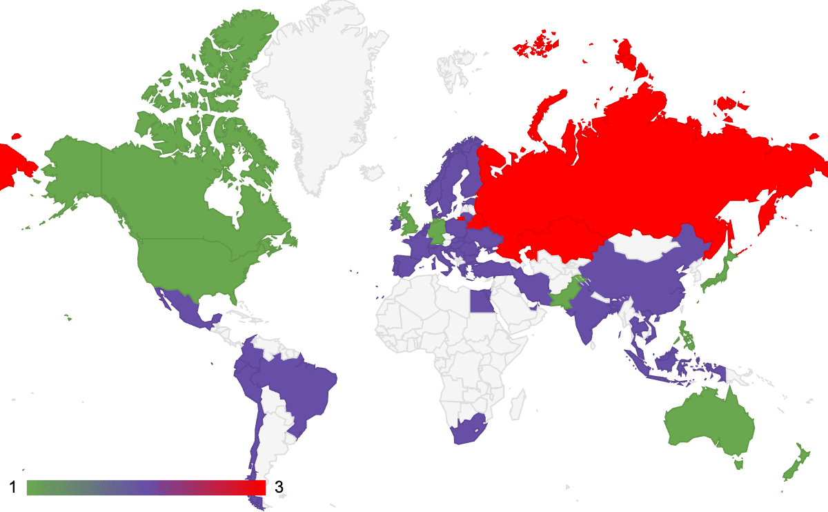 各国のトップの座を占めるのは、WooCommerce(紫)、Shopify(緑)、1C-Bitrix(赤)の3つの主要プラットフォームであることがわかります。この地図はGoogleスプレッドシートの制限により、これら3つのみを可視化しています。